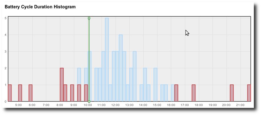 Graphical display of Device's battery cycles. Excluded cycles are shown in red, and the current cycle's time is shown as a green line.